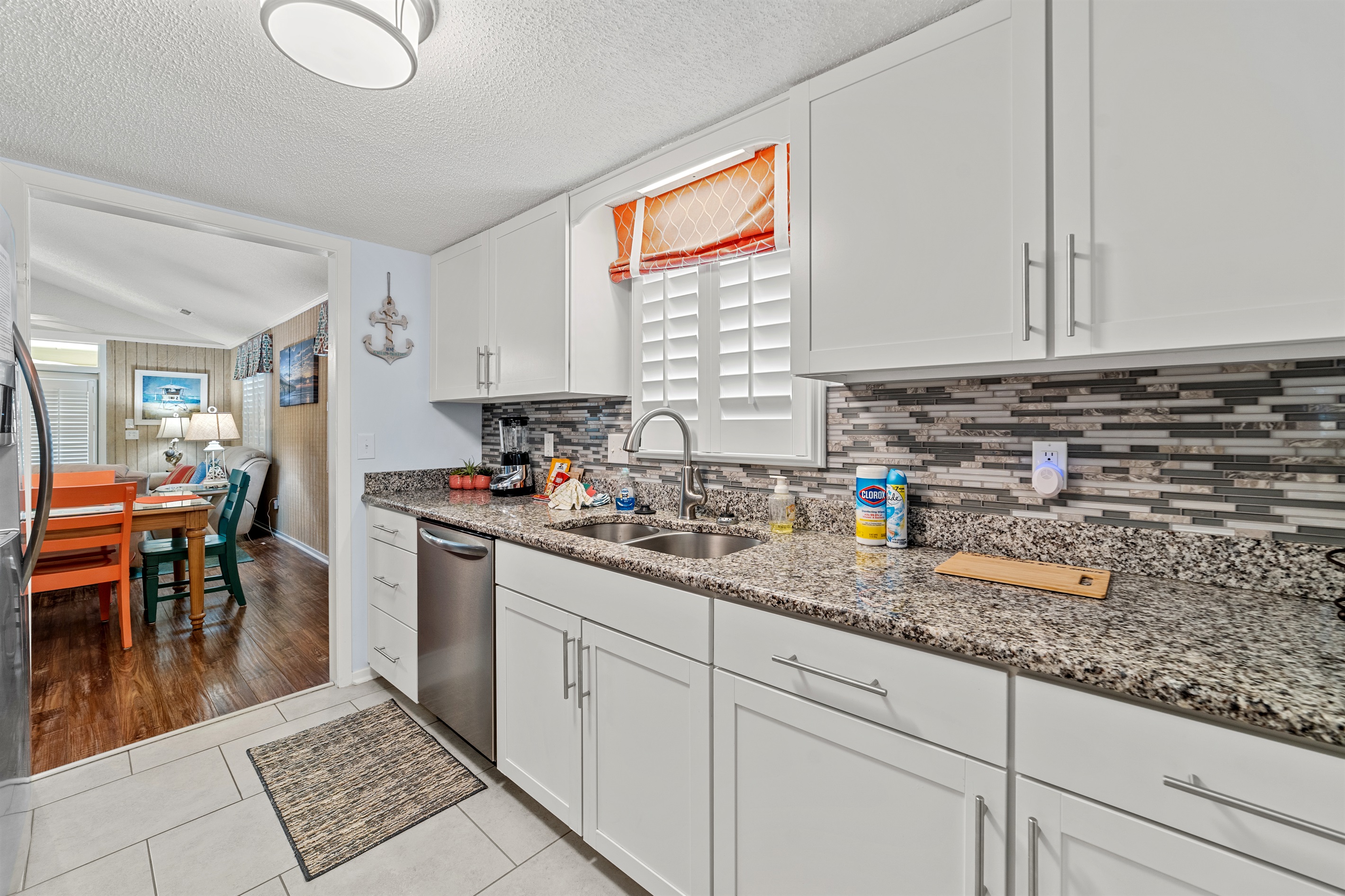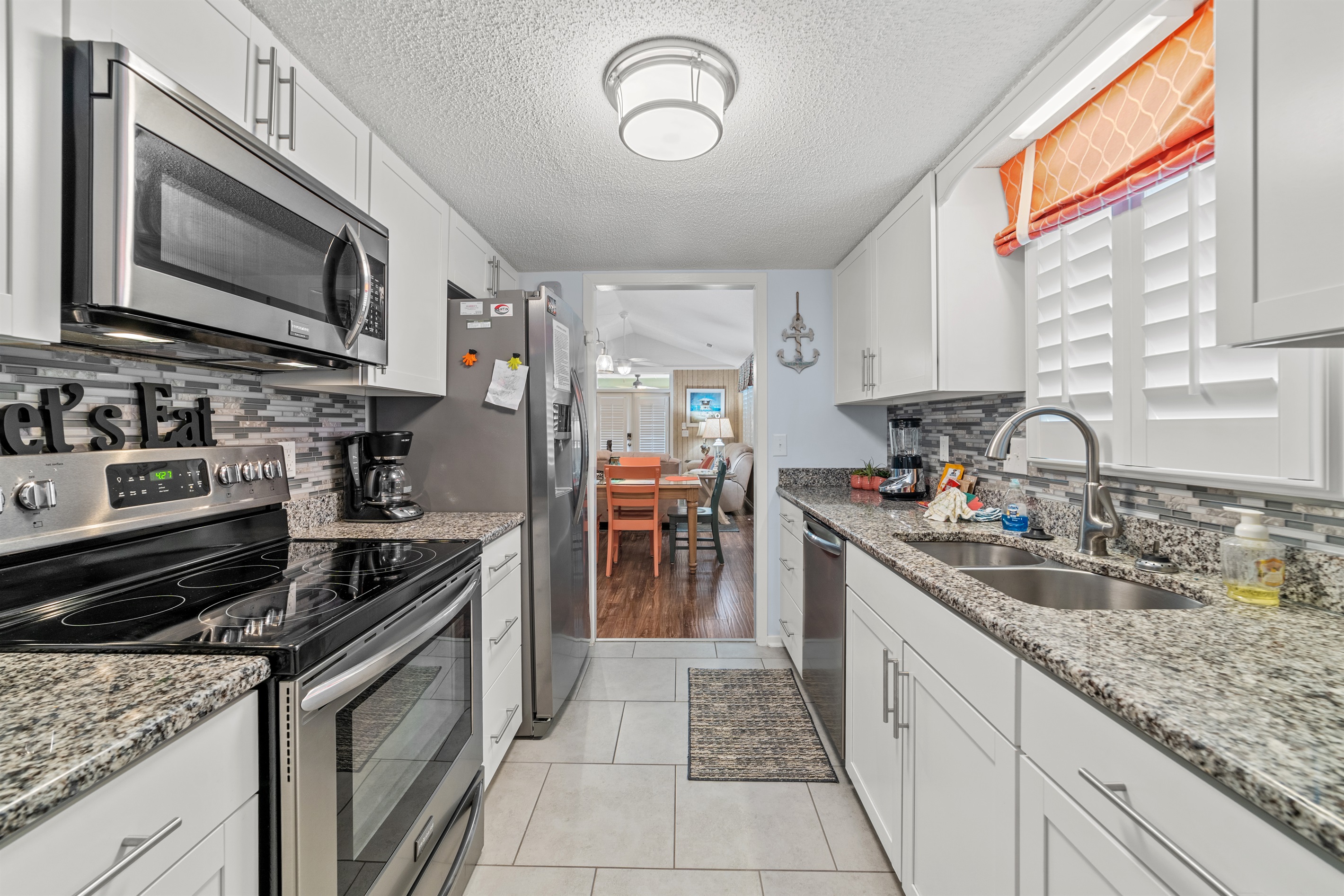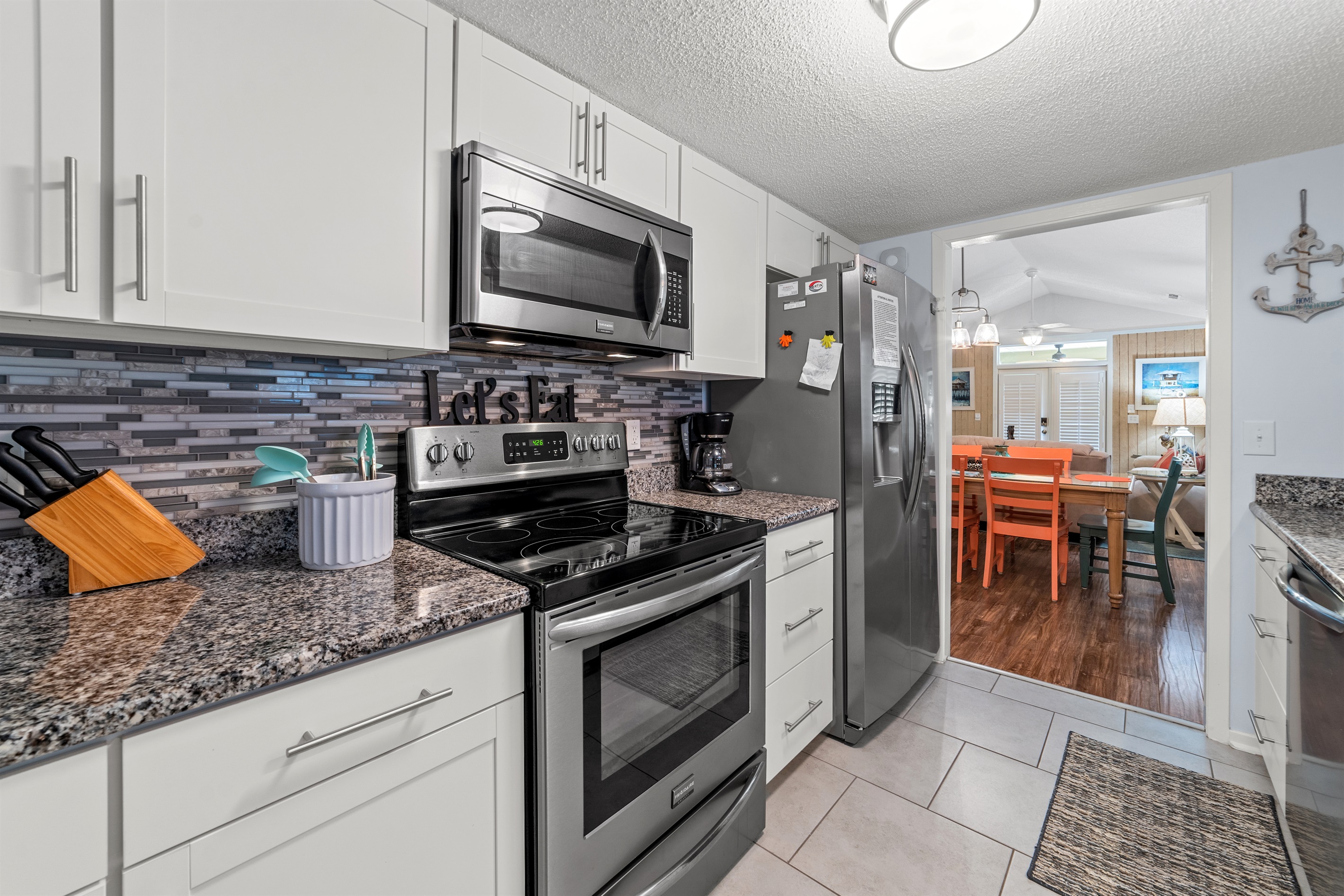 Spacious Open Layout: Relax in the large living room with vibrant dining space and an updated modern kitchen featuring stainless appliances and granite countertops.